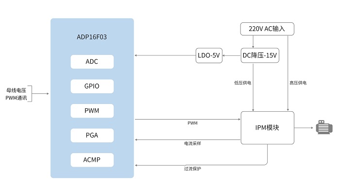 ADP16F03搭載16位定點DSP內核(主頻150MHz,哈佛總線結構),集成運算加速單元(支持除法、開方和帕克變換等指令),高效運行單電阻無感FOC算法,實現微秒級電機控制關鍵運算,為壓縮機與外風機協同調節(jié)提供強力算力保障。
